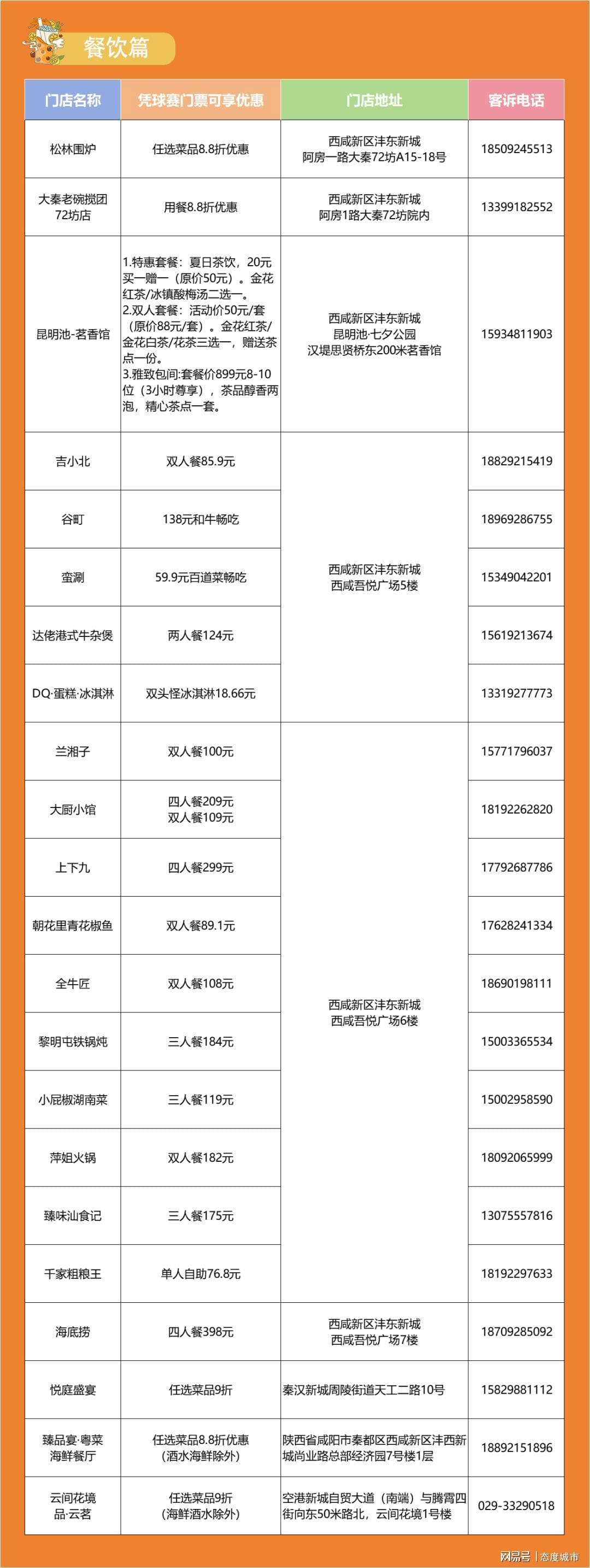 凭亚联赛门票,在以下商户消费可享统一门市价85折。