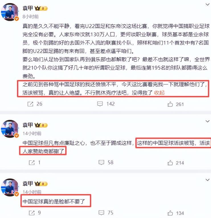 许多媒体人看到踢成这样都快要“炸”了,纷纷发文“炮轰”,像足球解说员袁甲一连发了三四条动态,表示自己的不满。