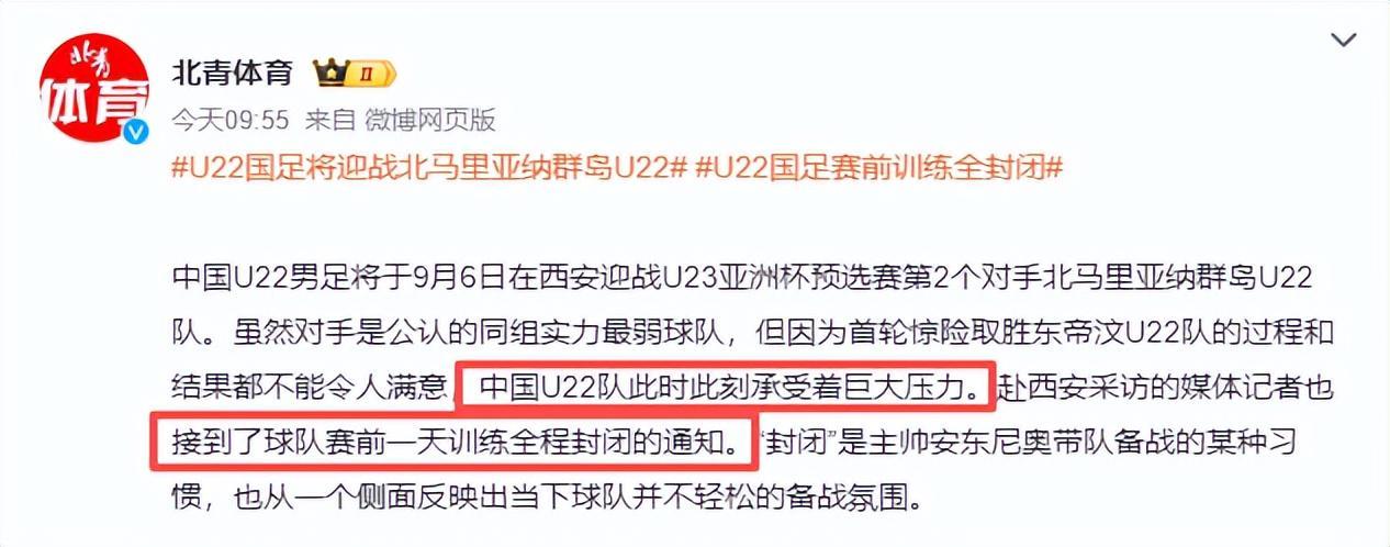 目前中国U22承受着巨大压力,目前球队赛前一天接受全封闭的训练,除此之外,中国足协分管国字号球队的副主席许基仁一直随队督军。